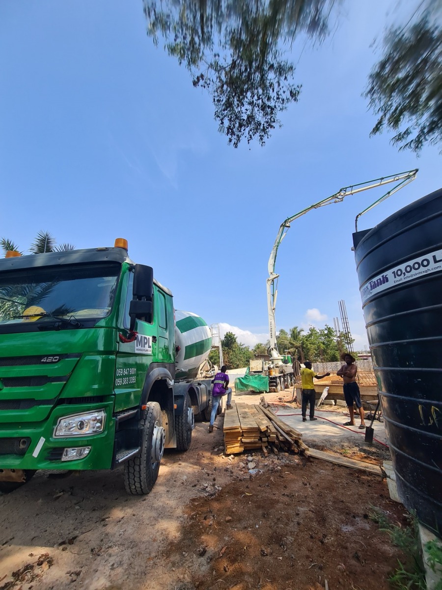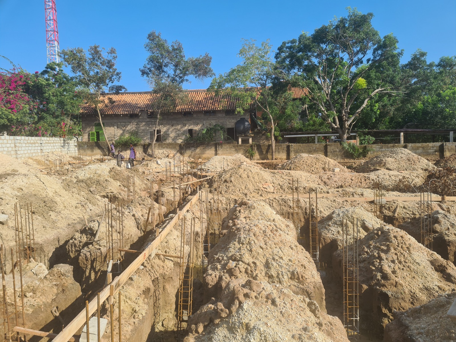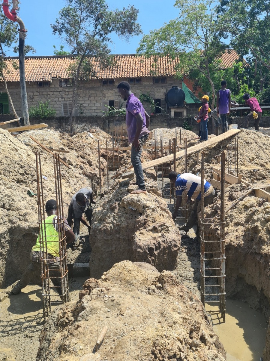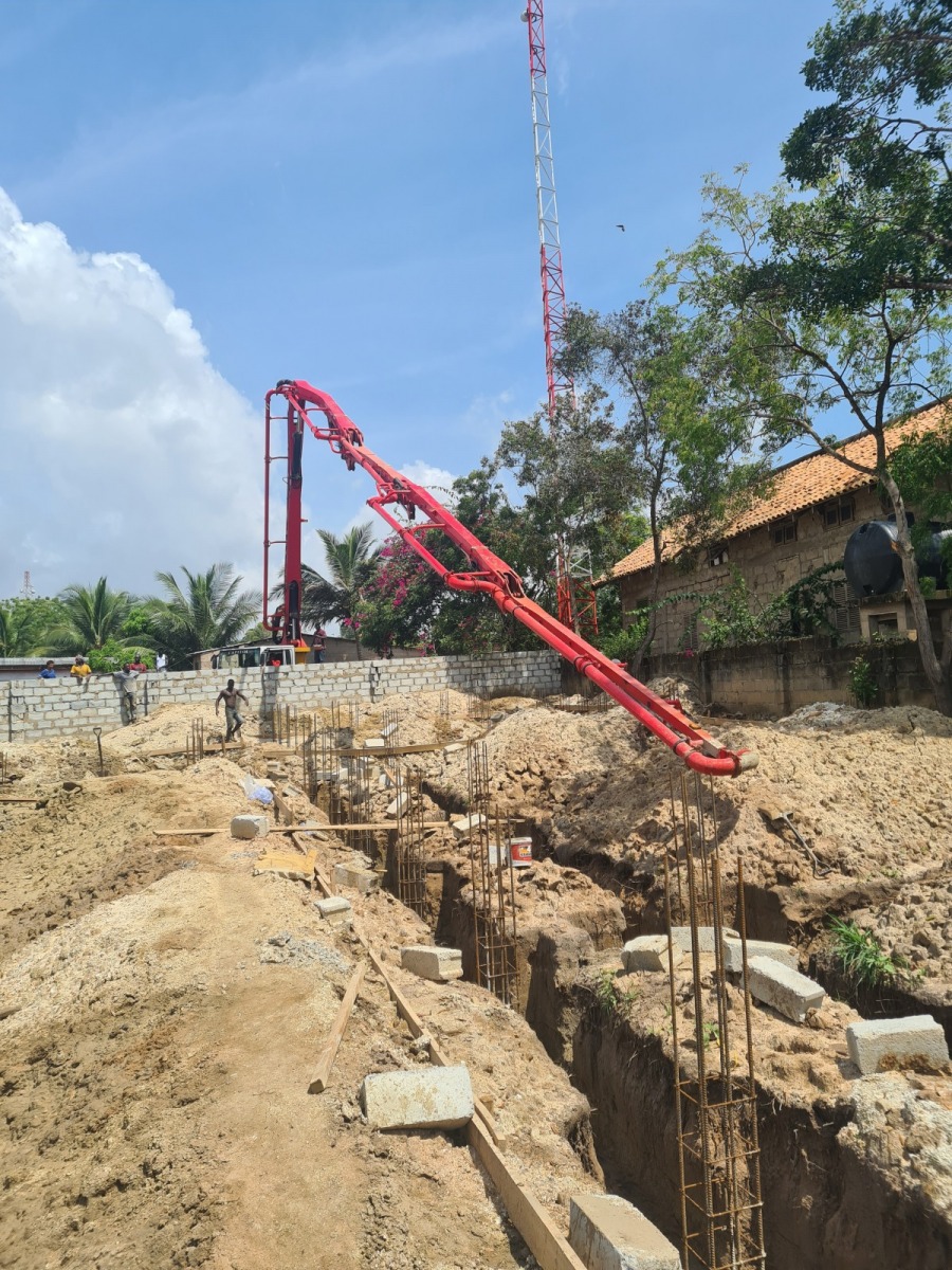 Our first phase of the project started with buildung the Foundation and over the last 2 weeks our workers were digging excavation pits down to the level of the groundwater. They also fabricated mats for the base of the steel colums which are important for the stability of the foundation. Unfortunately there were some heavy rainfalls which caused the excavation pits to fill up with water. This slowed down the whole process because it took our workers 2 days to pump the water out of the excavation pit. Since they finally managed to remove the water they could continue with the concrete filling. The Concrete mixers were turned on and all of the trenches could be filled up with the concrete. Now we really need to hope that it doesn’t rain during the next days.
